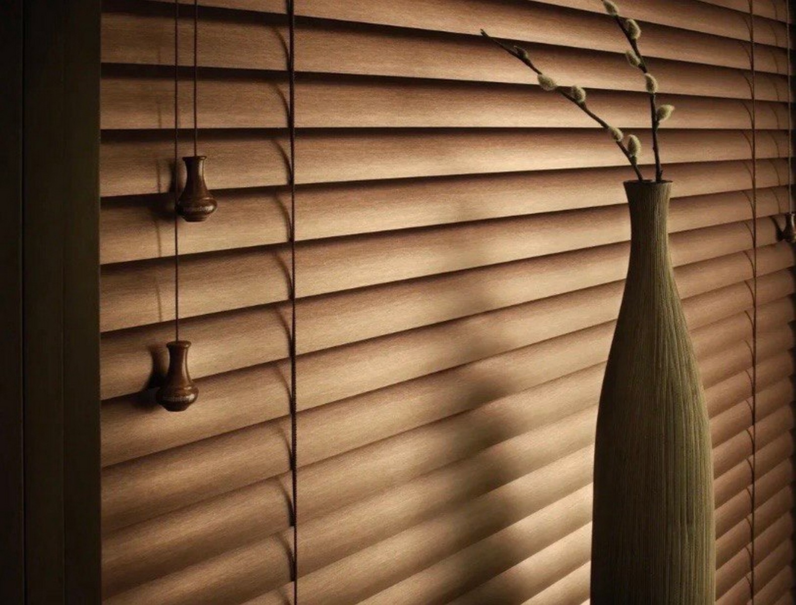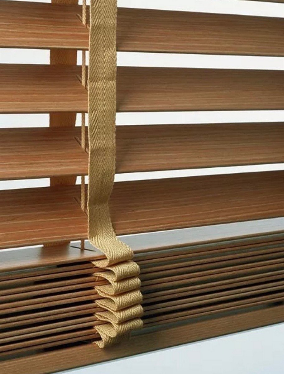 В горизонтальных жалюзи дерево/бамбук/ПВХ подъем и наклон осуществляется при помощи шнуров.