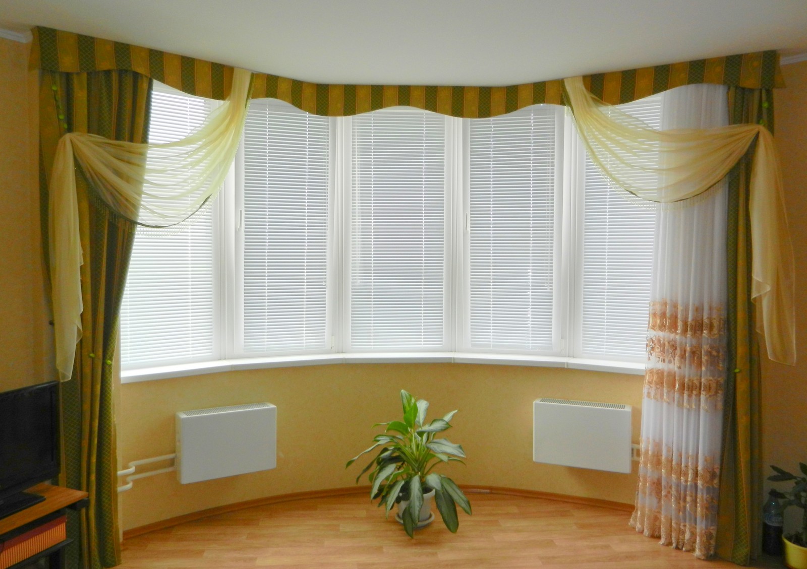Горизонтальные жалюзи подходят для оформления окна в тандеме с обычными занавесками. Кроме того, они надежно скроют комнату от любопытных взглядов и палящего солнца.